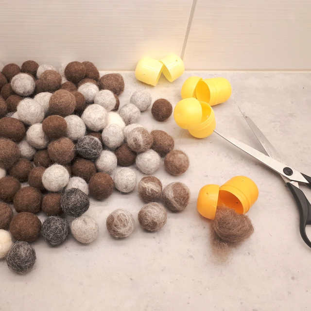 Huovuta kätevästi pesukoneessa pieniä huopapalloja. Vanhoihin pääsiäismunan muovikuoriin ruuvilla/saksilla reikiä, kierrä villa palloksi ja pesukoneeseen muun pyykin mukana. Pallon voi tarvittaessa laittaa useamman kerran pesukoneeseen halutun lopputuloksen saavuttamiseksi.