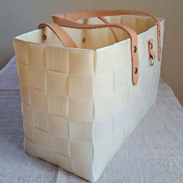 Materiaali: kierrätysmuovipäre, sangat kasviparkittua naudannahkaa