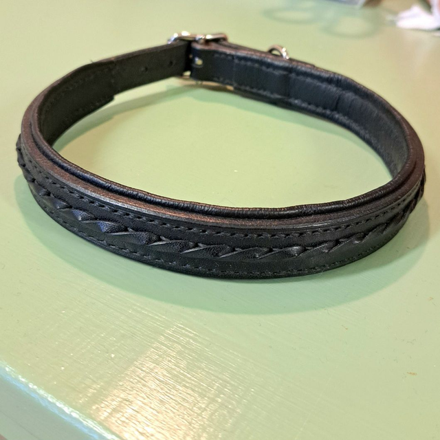 Kaulapanta sopii 39-45 cm kaulan ympärykselle. Pannan leveys on 1,8 cm ja vuorauksen kohdalta 2,4 cm. Mustassa pannassa mustat punoskoristeet.