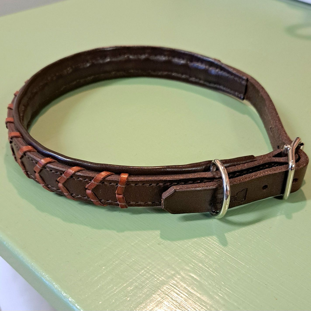 Kaulapanta sopii 42,5-50 cm kaulanympärykselle. Pannan leveys on 2,5 cm, toppauksen kohdalta 2,50cm. Tummanruskeassa pannassa konjakinvärinen ohjaspunoskoristelu.
