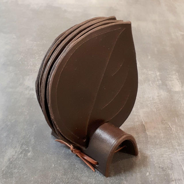 Nahkaiset lasinaluset 6 kpl ja teline. Lehdenmuotoisen lasinalusen halkaisia on noin xx cm ja paksuus 2mm.