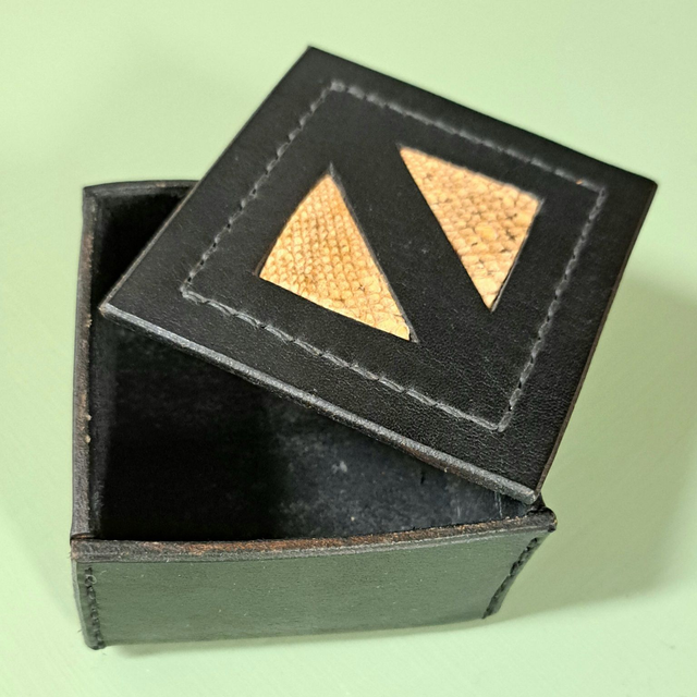 Tyylikäs musta nahkarasia sopii esimerkiksi korujen säilytykseen. Kannen koristeena on perinteisin menetelmin rasvaparkittua ja kasvivärjättyä kirjolohennahkaa.