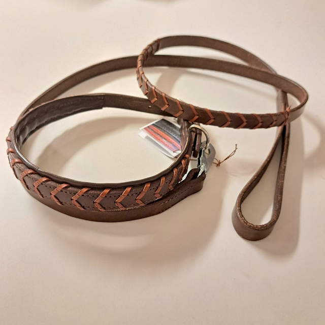 Tummanruskeassa värisessä talutushihnassa konjakinväriset ohjaspunoskoristeet.