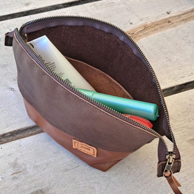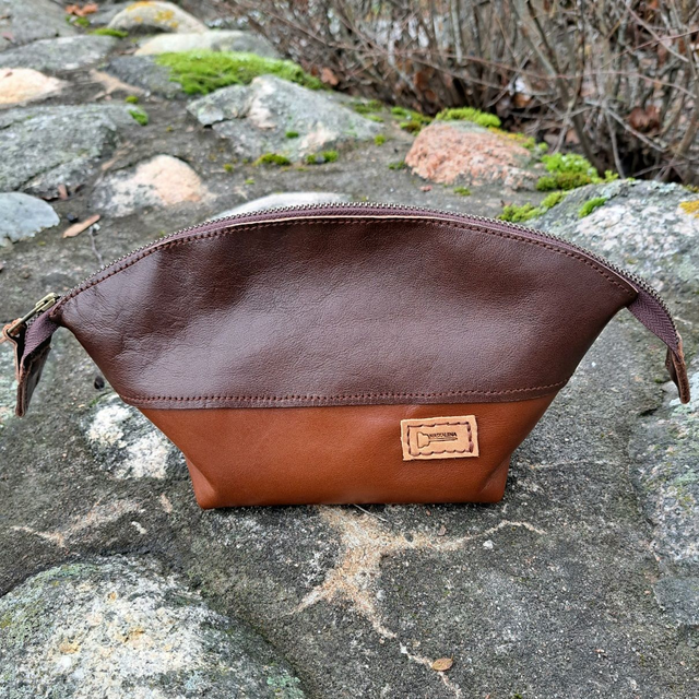 Nahkaisen toilettipussin sisään mahtuu näppärästi hygieniatarvikkeet tai meikit. Pussi aukeaa isoksi ja sieltä on helppo ottaa tarvitsemansa.